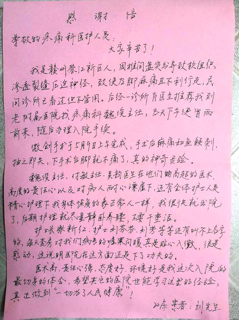 患者刘先生因椎间盘突出导致软组织渗透裂缝压迫神经,致使左脚麻痛不便行走,慕名前来该院疼痛科找魏俊主任诊治。在治疗过程中,刘先生为魏俊团队的高超医术折服,“术后麻痛如鱼鲠刺,抽之即失”,直呼“神奇灵验”!