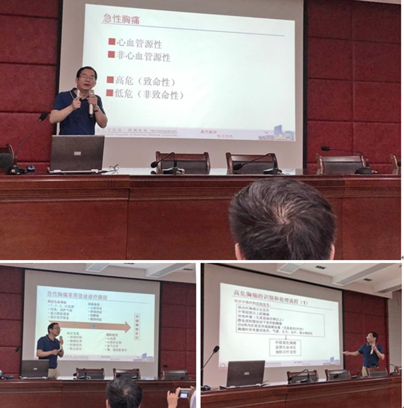 刘先发教授以“急性胸痛”为题,将急性胸痛的识别、诊断、鉴别诊断、国内外最新胸痛诊疗指南进行了深入浅出的讲解。并结合一附院建设国家级胸痛中心的经验,以及县级医疗机构自身工作特点,就急性胸痛处置的流程及制度建设给出了意见和建议。