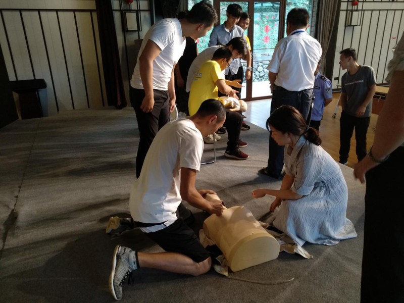 村民们在老师的指导下纷纷尝试,大胆体验,争先恐后进行急救技能训练。