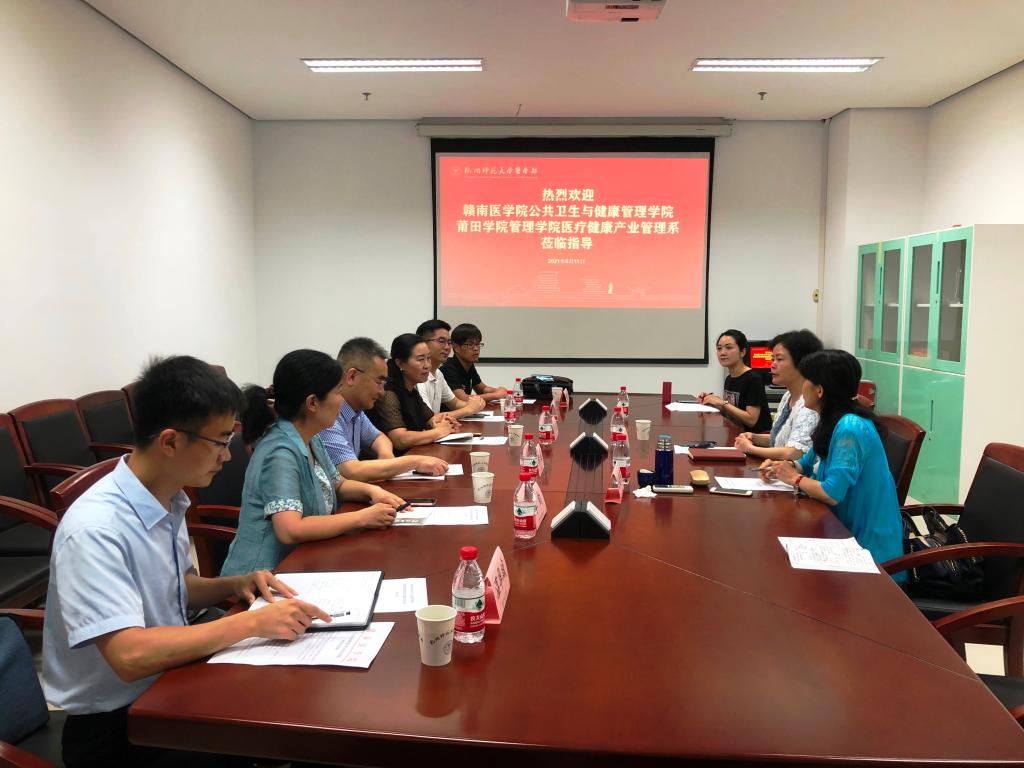 黄诚一行与杭州师范大学医学部许亮文副部长、健康服务与管理专业负责人任建萍等人进行了座谈交流,双方介绍了各自基本情况、发展历程及健康服务与管理专业的建设情况,并就健康服务与管理专业建设发展、人才培养、实践实训、实习就业、实验实训室建设、高层次人才引进等方面进行了深入交流。