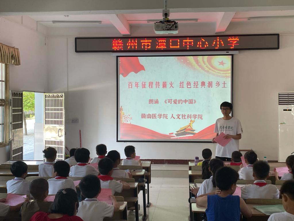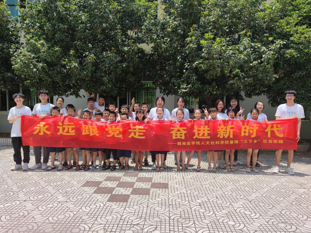 7月15日,人文社科学院组织12名大学生志愿者前往潭口镇中心小学开展“永远跟党走·奋进新时代”暑期“三下乡”社会实践活动。