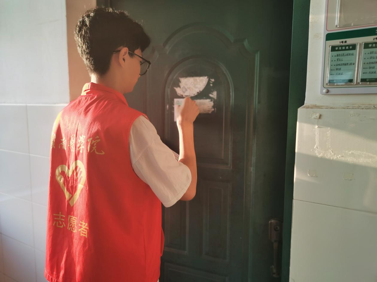 9月24日,该院志愿者到宿舍区域清理门上的贴纸、小广告等,规范宿舍成员信息标识,营造干净整洁的生活环境,助力学校“宿舍文明”建设。