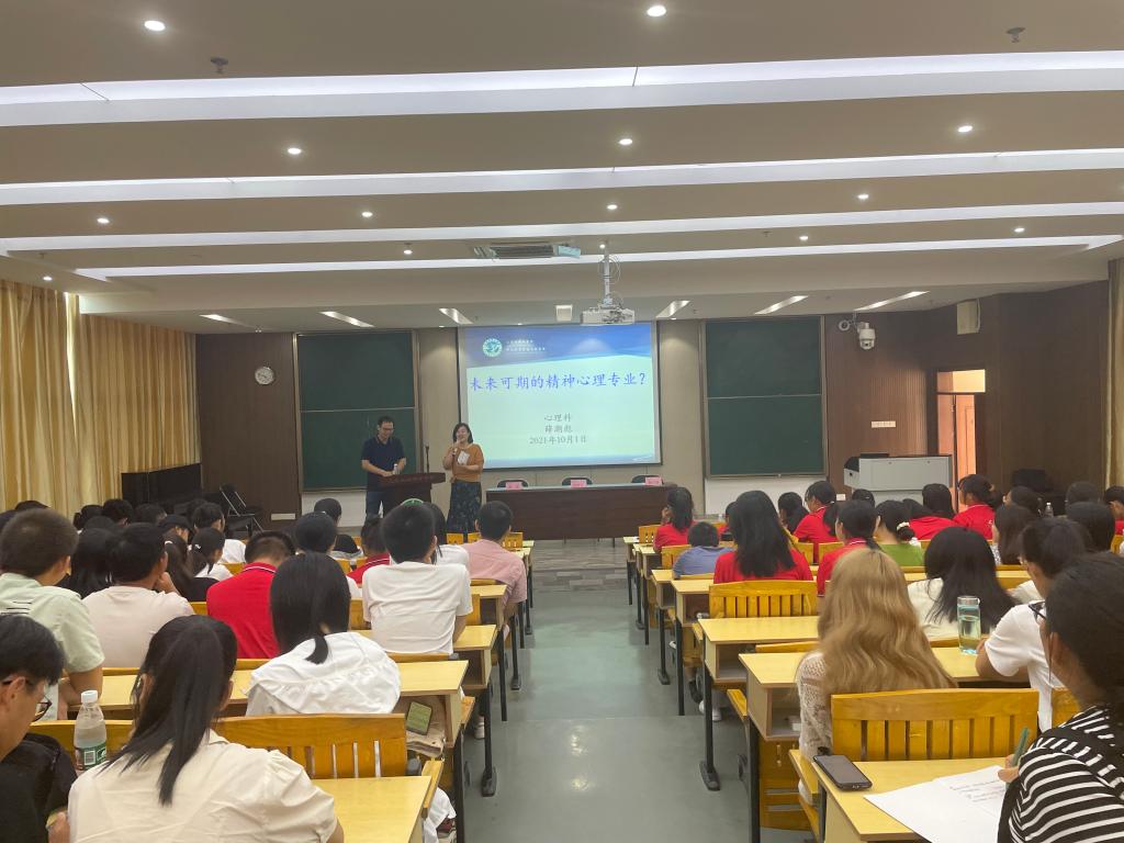 薛潮彪介绍了就职的医院、近期的研究成果和蓬勃发展的精神心理专业等,他用通俗易懂的语言、丰富全面的素材、细致耐心的解答为同学们指点迷津,让同学们对未来有更为清晰的规划。