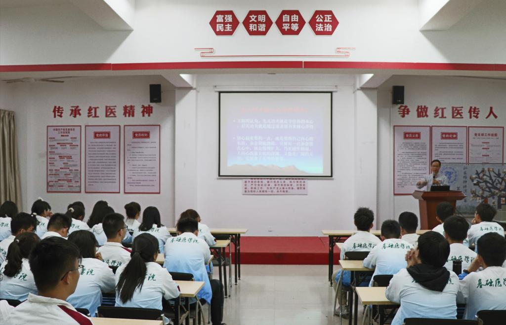 10月12日晚,基础医学院党委书记颜剑在黄金校区为2020级双立班全体同学讲授以“不忘初心,方得始终”为主题的班会课。