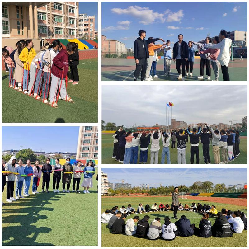 活动由心理咨询中心教师及经过培训的心理素质拓展团带领,2021级新生以班级为单位分批次参加活动。活动分为暖身破冰、团队建设、团队比拼和团队合作等环节,通过“异掌同声”“穿越呼啦圈”“鼓动人心”“动力圈”等项目展开,同学们欢声笑语一片,每项活动后的分享环节也让大家获得了心灵的感悟。